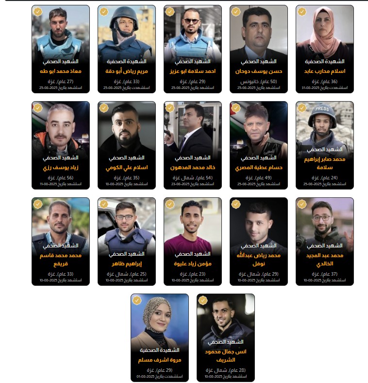 The Palestinian Journalists Syndicate has described August 2025 as a devastating month for press freedom, confirming that Israeli occupation forces killed 17 Palestinian journalists, including three women, Marwa Musallam, Maryam Abu Daqqa, and Islam Abed.