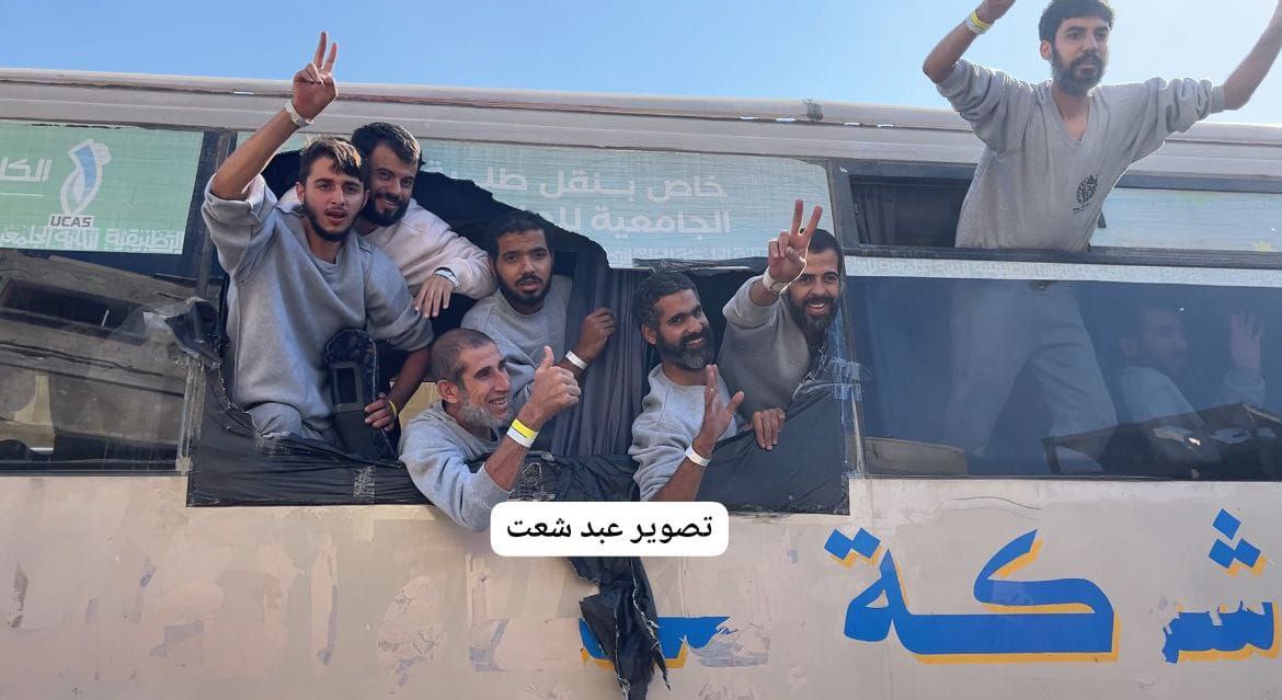 A Wafa news correspondent reported that 38 buses and 10 ambulances transported hundreds of released prisoners to Nasser Medical Complex in Khan Yunis.