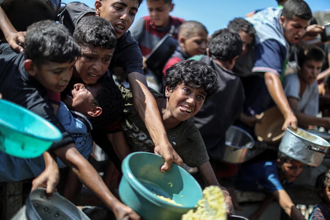 Desperately hungry Palestinians gather at a charity kitchen in Gaza City to get a small bowl of food amid the ongoing Israeli starvation campaign in the region.