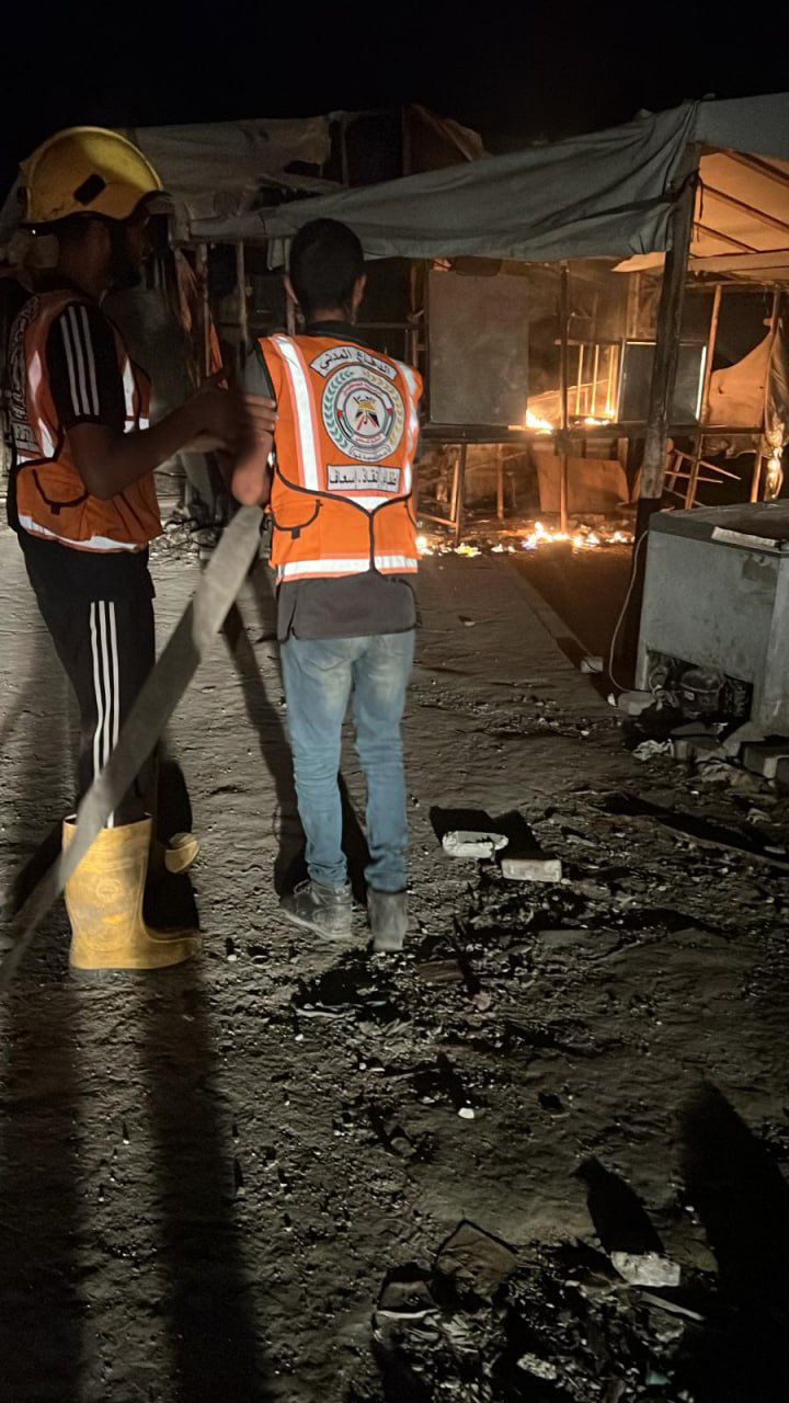 Civil defense teams are working to extinguish a fire that broke out after Israeli occupation drones dropped incendiary bombs on Al-Sheikh Radwan market area in northern Gaza City.