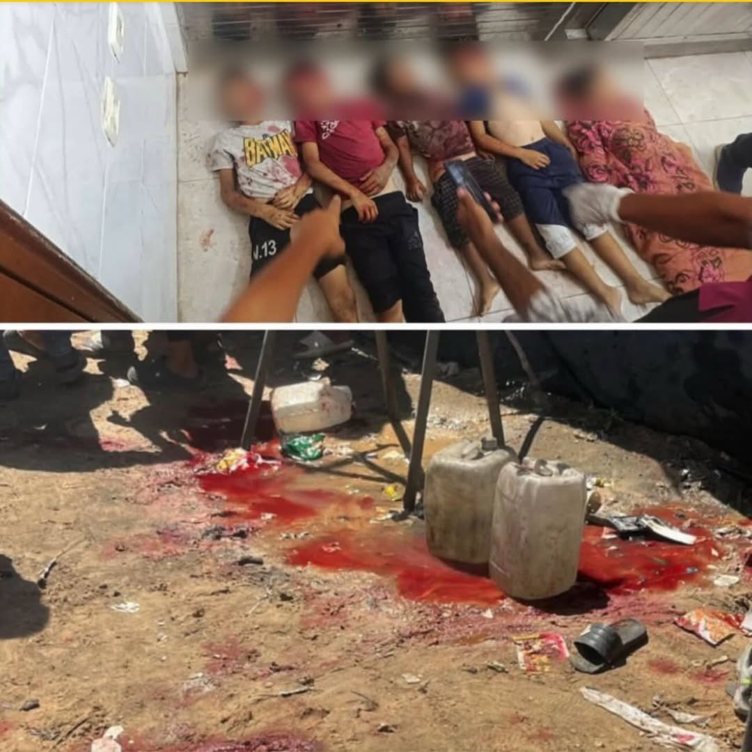 A group of children (image above) waiting in a line for water in the so-called ‘safe zone’ of al-Mawasi, in southern Gaza, were hit by an Israeli missiles and killed on Tuesday afternoon.