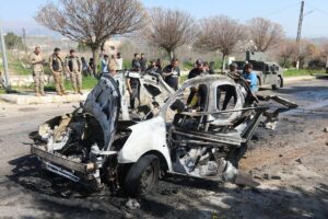 A vehicle targeted by an Israeli airstrike in the town of Borj El Mlouk, in the south of Lebanon on March 15 2025.