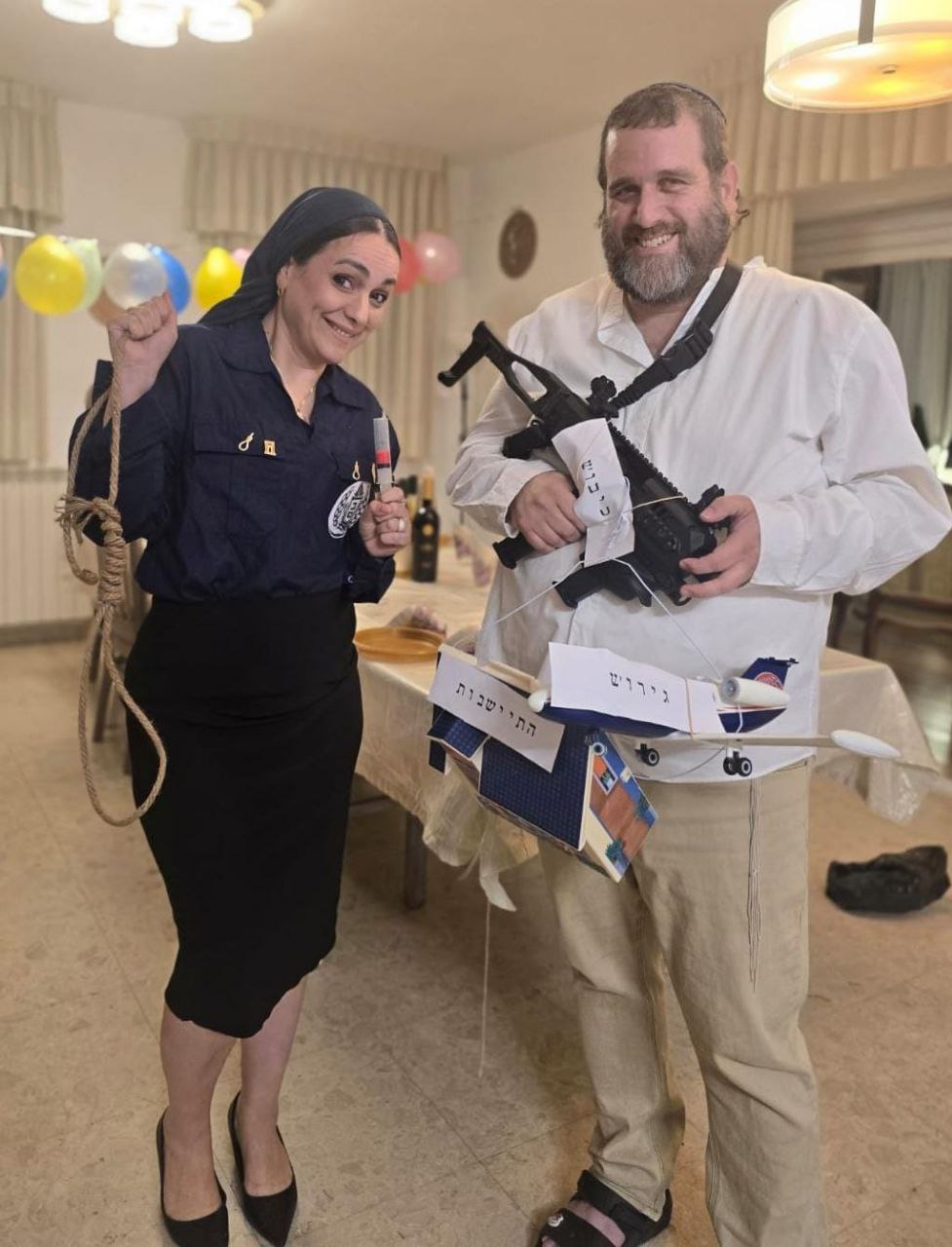 Her husband’s costume represented the themes “Occupation, Expulsion, Settlement.” He carried a prop gun labeled “Occupation,” a small model airplane marked “Expulsion,” and a miniature house labeled “Settlement.”