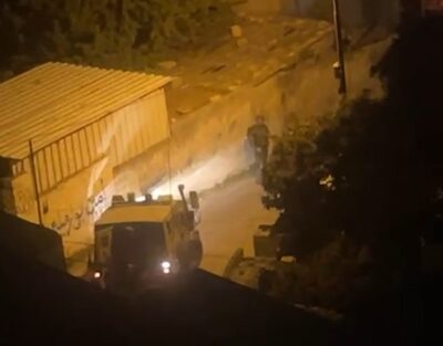 In Beit Ummar, north of Hebron, the soldiers stormed homes, fired sound bombs and toxic gas, before abducting Mousa Mohammad Bahar and his 14-year-old son Hamza.