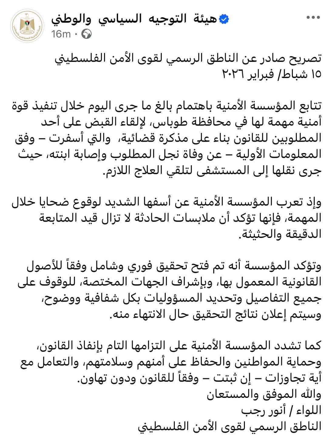 The security establishment is closely following what occurred today during a security force’s operation in the Tubas governorate to arrest an individual wanted by law under a judicial warrant.