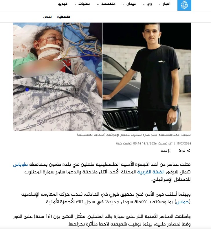 Al-Jazeera said 16‑year‑old Yazan Samer Samara was killed instantly when PA security personnel opened fire at his father’s car.