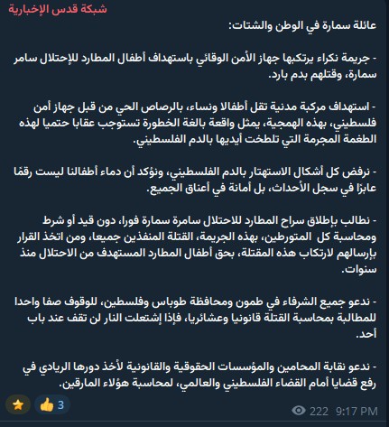 • A heinous crime has been committed by the Preventive Security Service, deliberately targeting the children of Samer Samara — who is pursued by the Israeli occupation — and killing them in cold blood.