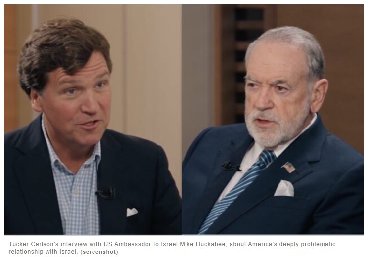 During their more than two-hour dialogue, Carlson, the rightwing commentator, repeatedly insinuated that Huckabee was more invested in defending the interests of Israel than those of the US. For his part, Huckabee – a prominent Christian Zionist – sharply disputed Carlson’s suggestions that Israel does not deserve the military and monetary aid it receives from the US (for a quick summary of Tucker Carlson’s 2 1/2 hour interview of Mike Huckabee, go here; to watch the full interview, go here).
