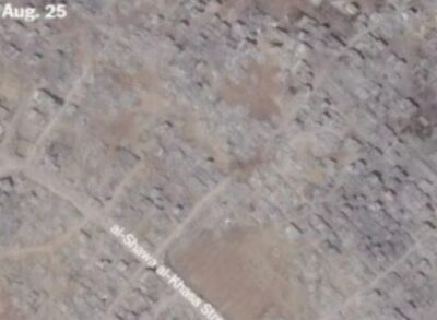 The first image, dated August 8, shows dozens of intact buildings and visible refugee camps. By August 25, the second image depicts widespread destruction—most buildings reduced to rubble and the camps erased.