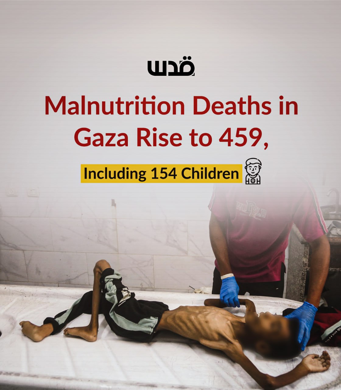 The Ministry of Health in Gaza announced that the total number of deaths due to malnutrition has risen to 459 since the beginning of the Israeli blockade, including 154 children.