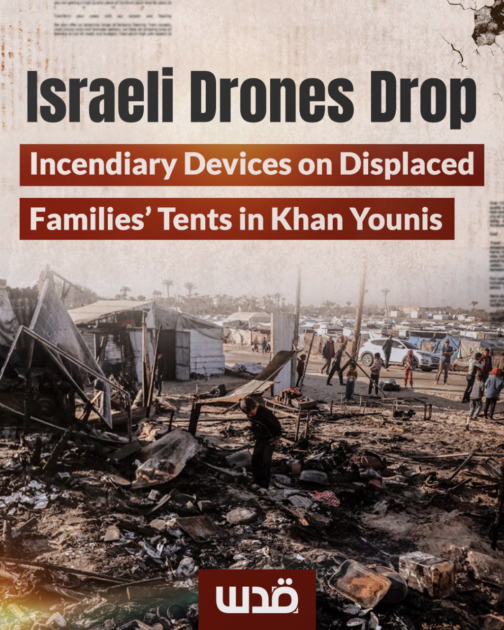 Israeli drones dropped boxes loaded with canisters containing gasoline, wired with fuses, over the tents of displaced families in Khan Younis, southern Gaza Strip.