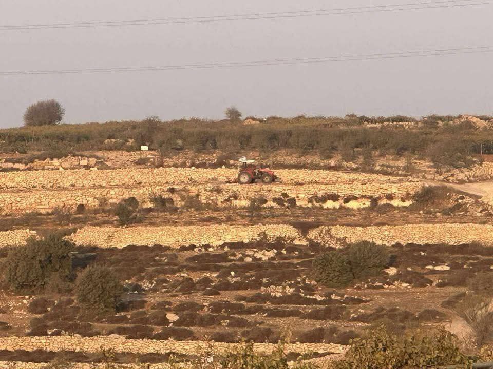 Israeli settlers under army cover plowed Palestinian farmers’ land, a set of ancient terraces with olive trees growing on them, near the town of Halhul, north of occupied Hebron. The paramilitary colonial settlers aim to ultimately claim ownership, according to local sources.